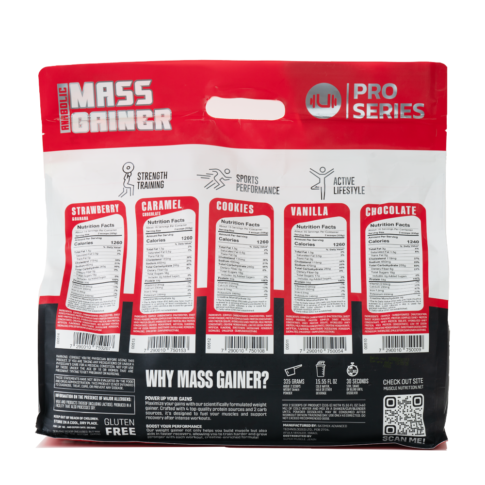 ماس جينير لزيادة الكتلة العضلية سعرات مكثفة نتائج ملموسة ! جينير متكامل لمن يسعى الى زيادة الوزن وبناء العضلات بتركيبة مدروسة علميا غني بالاحماض الأمينية الأساسية (EAA) والكرياتين جينير لزيادة الوزن – بنكهات مختلفة
